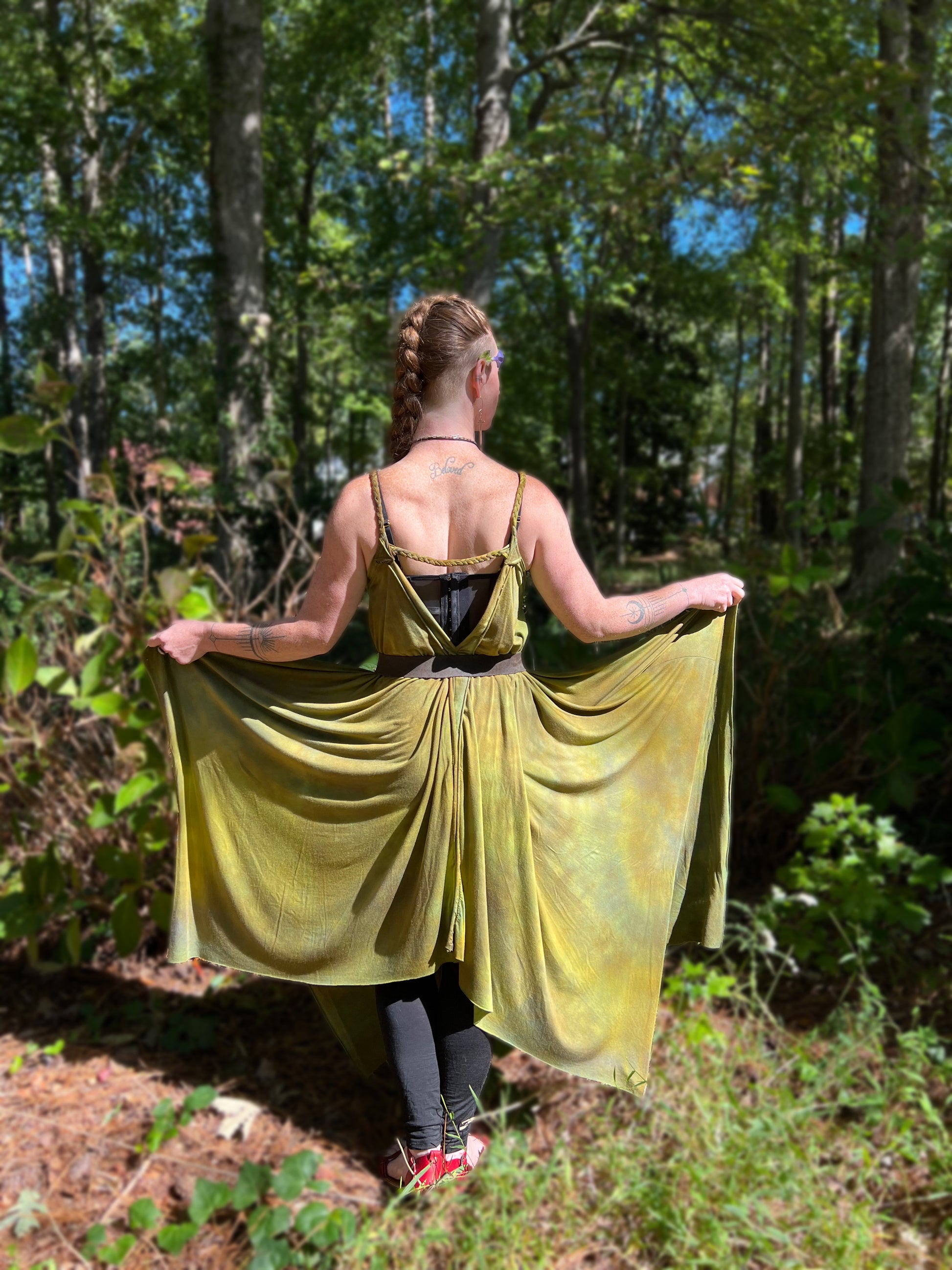 Adventuring dresses are sized by length in front and at the sides. Model shown is 5’3” tall for reference. Adventuring Dresses are designed to fit free size, taller or larger folks will want to choose a longer length for best fit. Have questions regarding sizing? Check out the size guide in my shop or head over to IG and check out the fit guide there! You are also welcome to reach out on any of the socials, I am always happy to help!