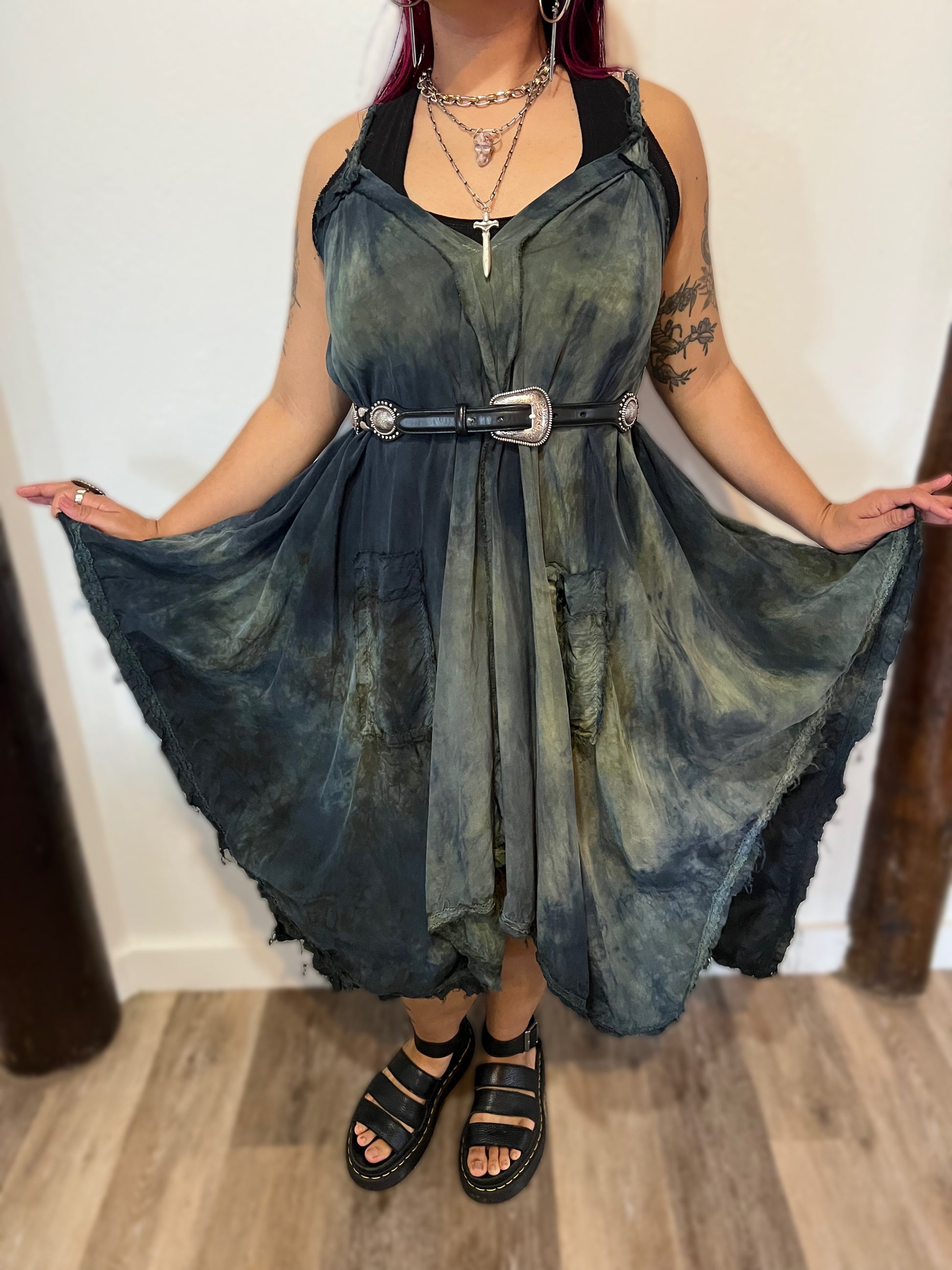 Made in soft and silky cupro, this dress features six pockets and vintage cotton lace trim. Distressed details surround the hem of this dress in the form of frayed edges. If this is not to your liking simply snip them off, you will not damage the integrity of the garment. Cupro is essentially vegan silk, created in a closed loop system from waste wood pulp. These dresses are smaller and will best fit folks with a 40” or less chest circumference. These dresses are sized 34”X30”.