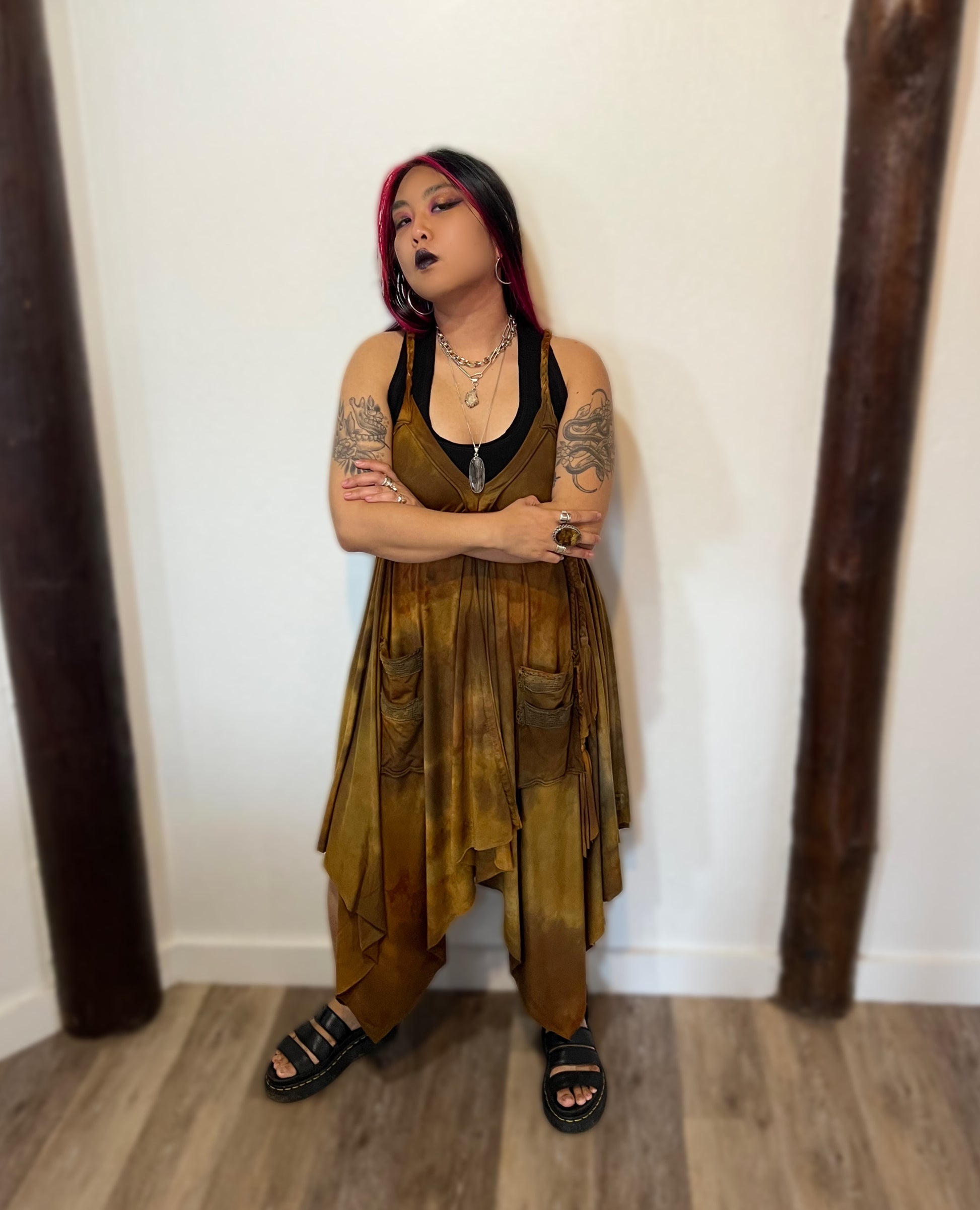 Adventuring dresses are sized by length in front and at the sides. Model shown is 5’ tall for reference. Adventuring Dresses are designed to fit free size, taller or larger folks will want to choose a longer length for best fit. Have questions regarding sizing? Check out the size guide in my shop or head over to IG and check out the fit guide there! You are also welcome to reach out on any of the socials, I am always happy to help!