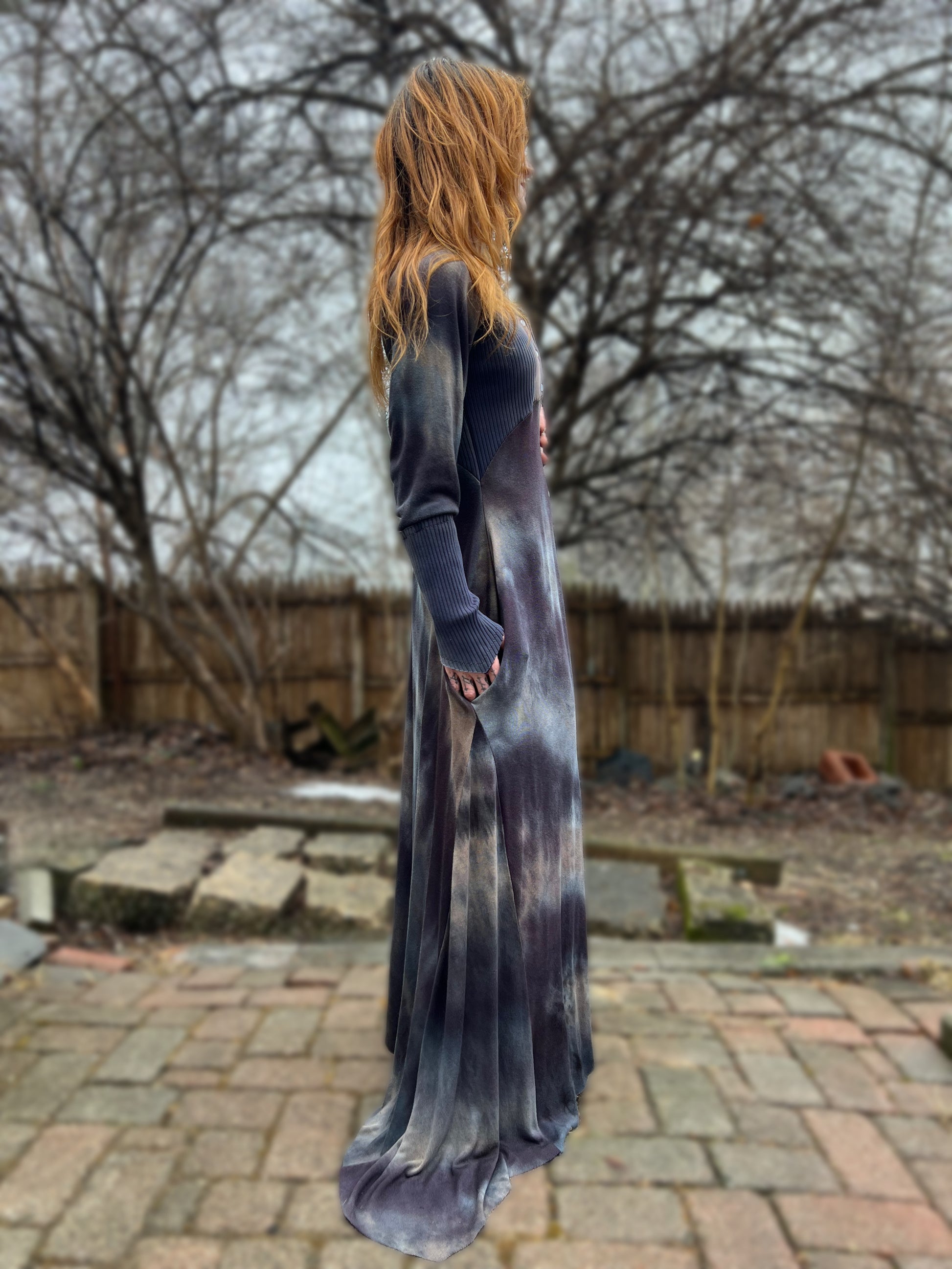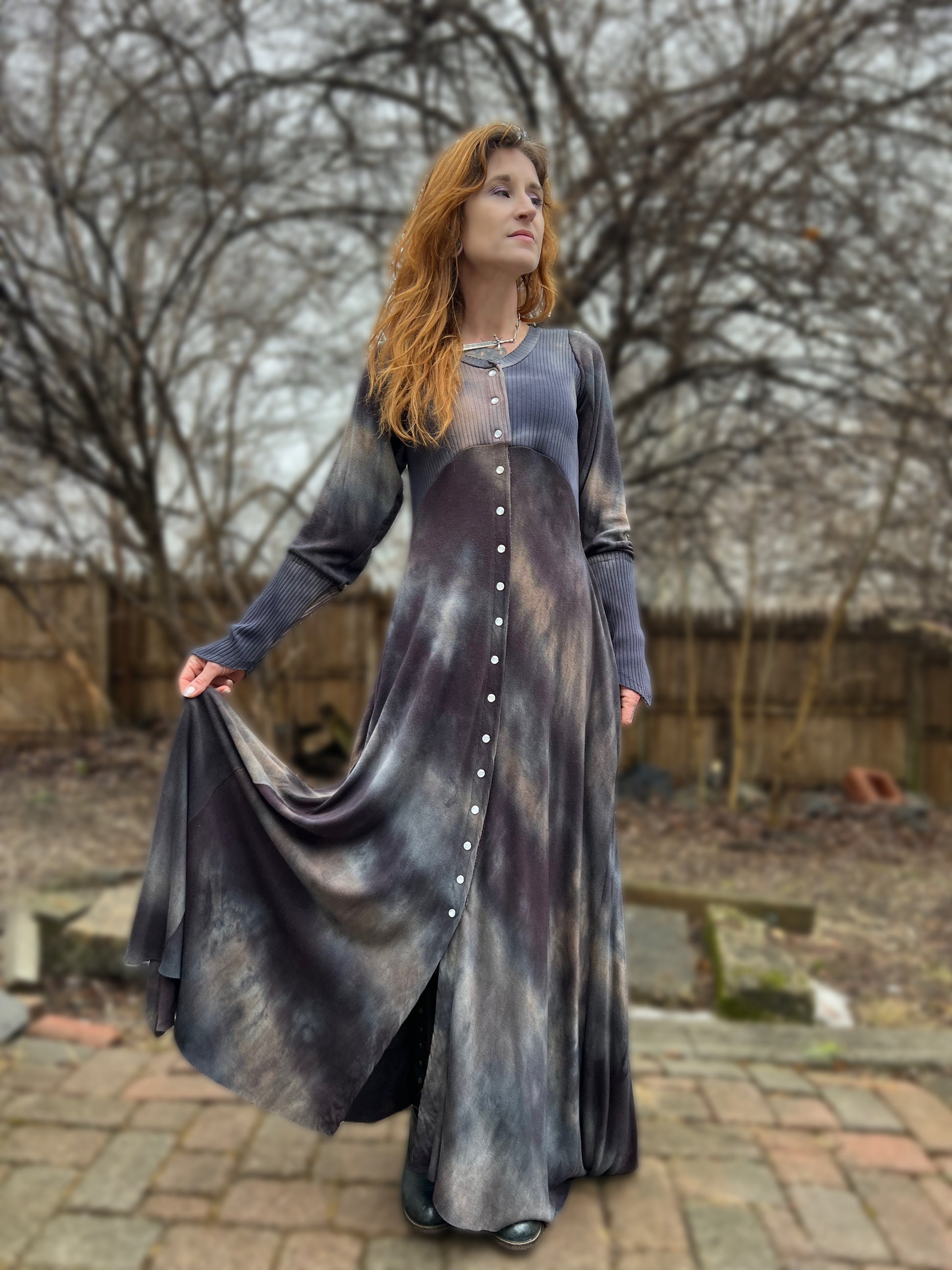 The May Queen gown in organic cotton rib knit and Lenzing Tencel Hacci knit. This gown features deep seam pockets, pearl snaps all the way down the front, and relaxed sleeves with my signature pointed cuffs. This dress is the only one of its kind! Raw hem can be trimmed by you for the perfect fit. This dress will fit a 34”-38” chest and up to a 32” waist.57” long from shoulder to floor.