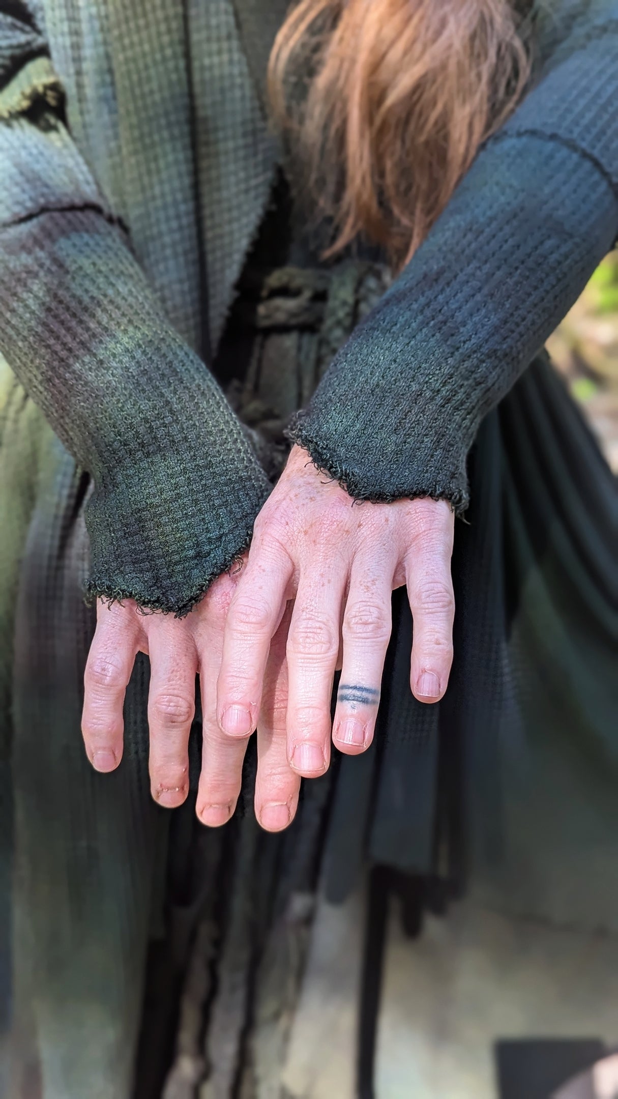 The Traveler's Cloak is back, this time in organic cotton waffle knit and a cropped silhouette. This cloak is thick and soft, with an oversized hood and attached scarves that can be worn multiple ways. Deep seam pockets and a matching braided belt, along with my signature pointed cuffs complete the look. Cuffs can be folded up for a different look. This is a much smaller size than I typically create in this design, best fits a smaller person. Model shown is 5’2” for reference. Questions regarding sizing? Feel free to message on the socials or shoot me an email, Im always happy to help!